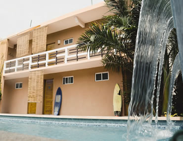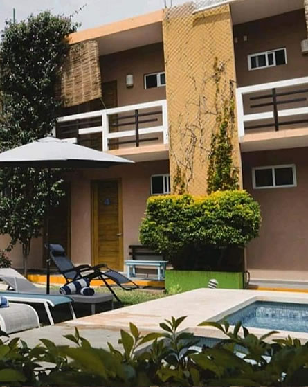 Hotel a pocos metros de la playa, con piscina al aire libre, jardín, terraza y estacionamiento gratuito. Habitaciones con aire acondicionado, wifi Starlink y baño propio con ducha y artículos de aseo.